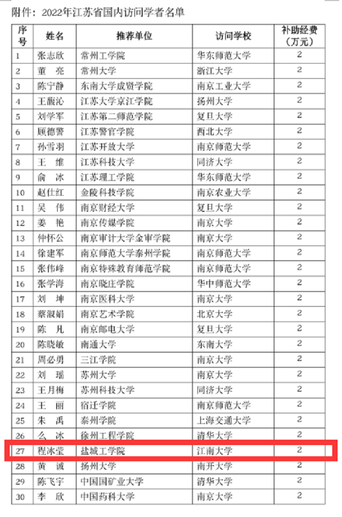 根据《省教育厅关于做好2022年度本科院校教师培训工作的通知》 (苏教师函〔2022〕15号)文件精神,经个人申报,各院校推荐,省高校团队培训中心组织评审,从全省各个高校中选拔出30名教师为2022年江苏省国内访学人员,公司程冰莹老师获批此项殊荣。