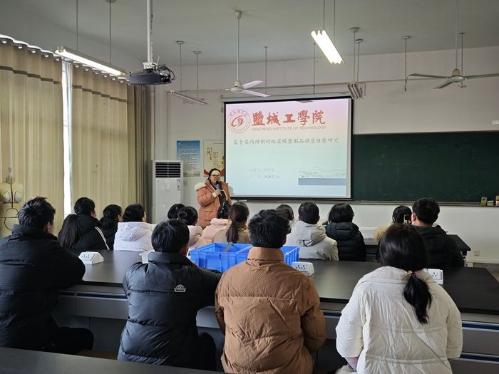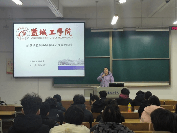 任晓慧博士分别以“基于浆内助剂对纸浆模塑制品强度性能研究”和“纸浆模塑制品防水防油性能的研究”为题作教师、员工专题报告,展示在企业锻炼的情况,分享在实践锻炼中获得的新知识、新工艺、新产品等。