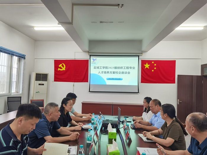为推进校企合作与交流,发挥双方协同育人作用,7月20日下午,PA视讯宋孝浜书记、王春霞经理一行5人赴江苏悦达棉纺有限公司、江苏悦达家纺有限公司举行2023版纺织工程专业人才培养方案(修订)校企座谈会。