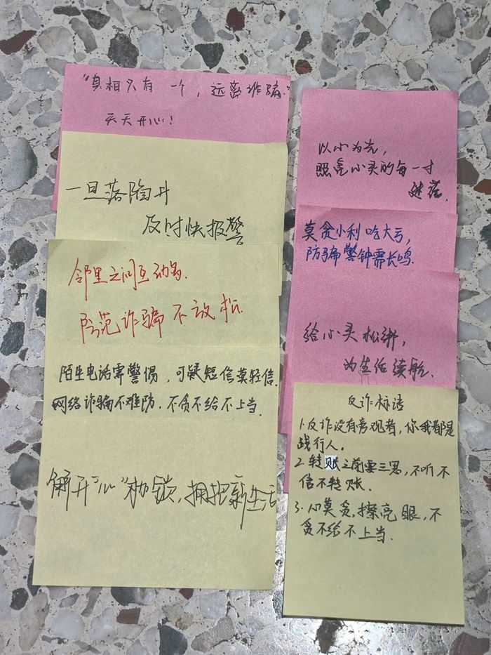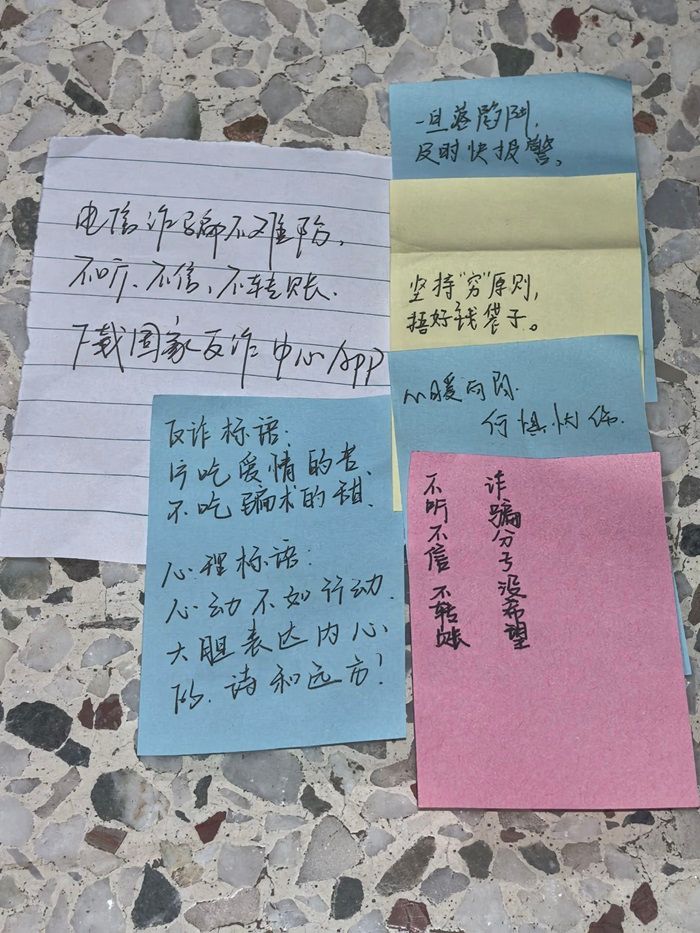 本次活动独辟蹊径,从心理学视角解析诈骗套路,通过“游戏+创作”双维度互动,引导参与者深度理解诈骗分子的心理操控机制,实现从“被动防御”到“主动思辨”的意识跃升。助力同学们从被动防骗转向主动思考,全面提升反诈意识。在“反诈标语创作”环节,同学们将生活观察与心理学知识相结合,创作出百余条兼具警示性与趣味性的标语。随后,工作人员将标语打乱,让同学们抽取并读出标语内容,不同风格的标语引起大家热烈讨论,一些有创意的标语也引得现场笑声不断。有的以夸张对比强化记忆,有的则直击“身份伪造”的诈骗核心。这种源自同学们原创的宣传方式,极大地增强了大家的参与感。不仅让传同学们更透彻地理解反诈知识,还通过 “二次教育”,让大家更深切地明白反诈的重要性。