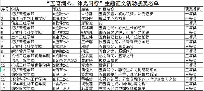 PA视讯坚持五育并举、三全育人,积极开展“五育润心,沐光同行”心理健康教育活动。在校心理健康中心的带领下,五月公司协办开展了“五育润心,沐光同行”主题征文活动,旨在通过员工写作讲述成长中德智体美劳的价值,引导老员工重视心理健康、培养健康平和心态,并激发大家对心理健康的关注。本次征文主题为“五育润心,沐光同行”,最终共收到征文86篇。同学们可根据主题自行确定征文题目,体裁丰富,包括但不限于诗歌、随笔、感想、体会。大家结合自身心路历程,书写自己的心情,创作出多样化的心理征文作品。其中,朱诗甜,侯烨琳二人获得一等奖,邢智波等五人获得二等奖,邓媛等十人获得三等奖。