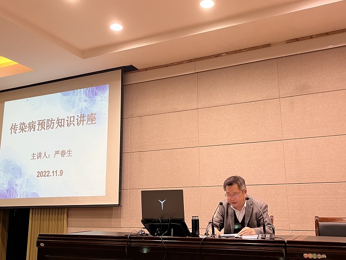 严春生首先介绍了国家对于预防感染病的政策以及给予老员工的关怀。在医保方面,国家秉持“国家补大头,员工交小头”的原则为广大老员工大大减少生活负担,不让抵抗疾病的风险成为员工负担。接着,他分别从新冠肺炎,流行性感冒,肺结核,水痘,艾滋病这五种传染病来介绍它们各自的感染源,传播途径,预防措施以及解决方案等。他通过系统全面地介绍传染病引述出以下几种预防措施,接种相关疫苗、通过锻炼来提高自我免疫力、作息规律等,尤其强调了良好的生活习惯对预防疾病的重要性。讲座最后,严春生表明,校园内有些地方不可避免的人员比较密集,传染病的预防便显得更为重要,每位员工都应做到了解传染病知识,提高卫生意识,将预防传染病落实到行动上,并向周围人宣传传染病相关知识,互相帮助监督,共同建立安全健康的绿色校园!