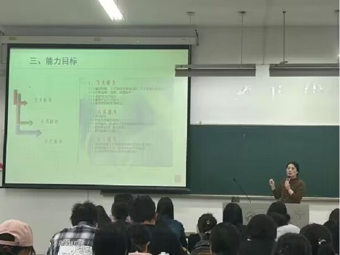 讲座开始,柏昕老师进行了自我介绍并向同学们展示了往届优秀学员的毕业设计。本次讲座中,柏昕老师主要从就业前景、专业人才培养目标、能力目标、职业面向、课程体系与专业特色、团队团队、实验室实习基地、希望和要求八个方面展开专业介绍。