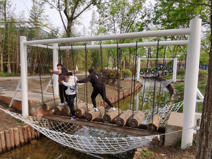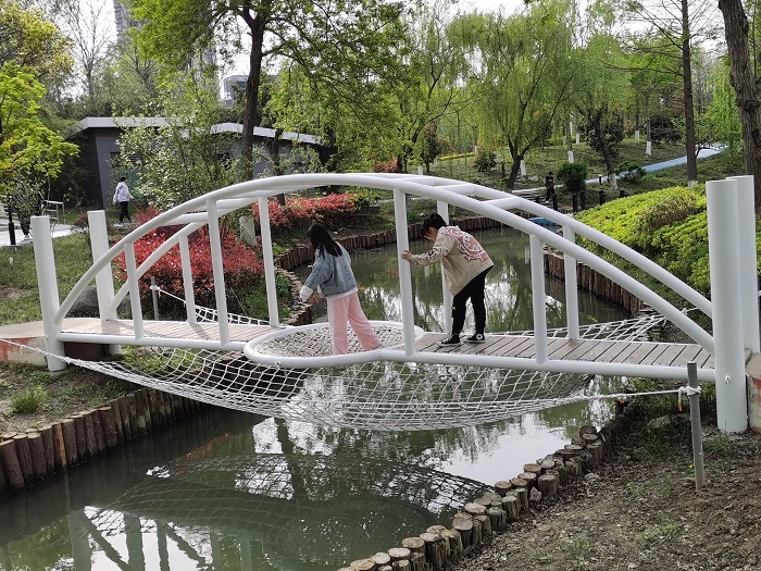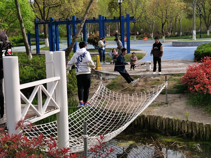 盐渎公园,素有情景交融,五彩缤纷的水绿博览园美称。秀木与修竹争翠,奇花与异草争艳,满园常绿,景色宜人。正值阳光明媚,百花争艳,同学们三五成群地来此踏青,欣赏公园美景,兴高采烈地游玩了“石门踏浪”“鹤舞琴音”“八桥小趣”等景点。玩梅花桩时“惊险不断”、乐趣横生。踏上铁索桥时,大家都摇摇晃晃的,很难平衡,却皆是不掩饰喜悦之情,笑语盈盈心中欢。