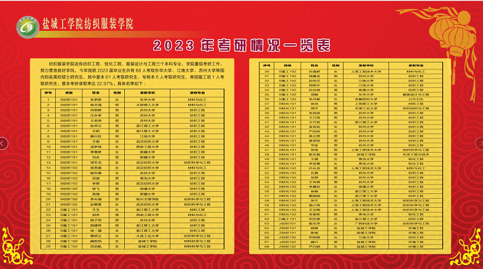星光不负赶路人,时光不负考研人。在全体老师和同学们的共同努力下,2023年PA视讯共有68人考取东华大学、江南大学、苏州大学等国内知名高校硕士研究生,其中普本61人考取研究生,专转本6人考取研究生,单招服工班1人考取研究生,普本考研录取率达32.97%。公司2021年普本考研录取率为31.95%,2022年为35.23%,连续多年普本考研录取率稳定在30%以上。