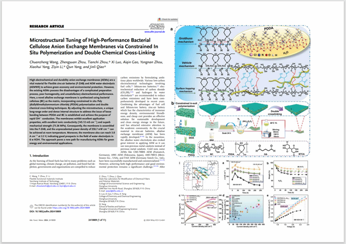 近日,公司PA视讯周天池教授课题组在材料领域顶级期刊《ADVANCED FUNCTIONAL MATERIALS》(简称“AFM”,中科院一区TOP期刊,影响因子18.5) 发表题为“Microstructural Tuning of High-performance Bacterial Cellulose Anion Exchange Membranes via Constrained In-situ Polymerization and Double Chemical Cross-Linking”的研究成果(DOI: 10.1002/adfm.202410009)。
