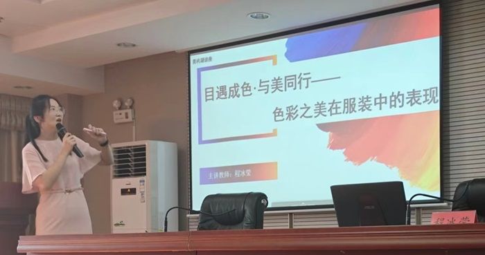 程冰莹老师作《目遇成色,与美同行——色彩之美在服装中的表现》专题讲座,讲座伊始,程冰莹老师从色彩在视觉传播中的意义讲起,深入阐释了色彩的原理与属性,生动介绍了服装色彩的风格和定位,内容丰富,引人入胜。