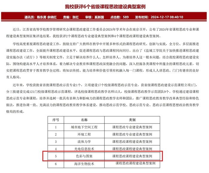 近日,江苏省高等公司教学管理研究会课程思政建设工作委员会2024年学术年会在南京召开,公布了2024年省课程思政专业和课程建设典型案例征集评选结果,公司程冰莹老师团队的《色彩与图案》课程获评江苏省思政课程建设典型案例。
