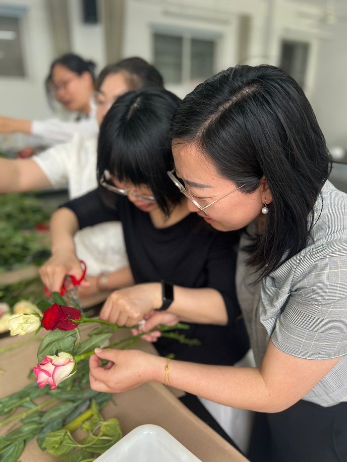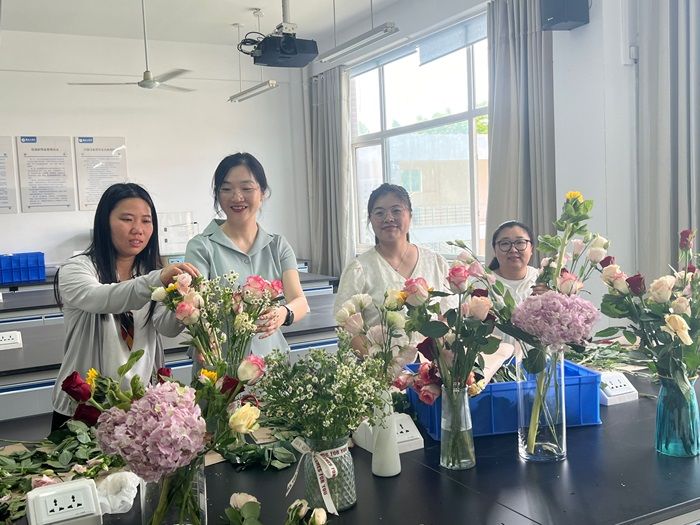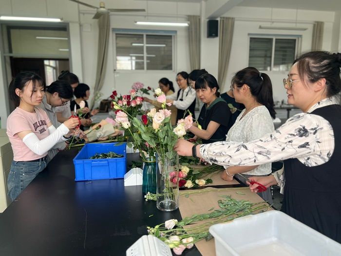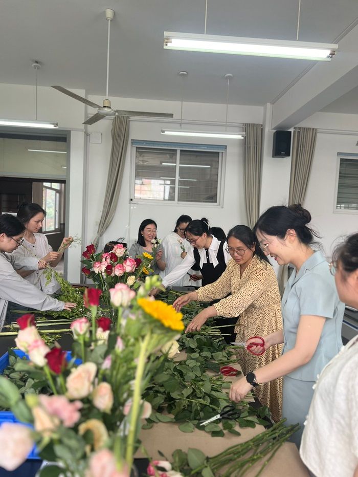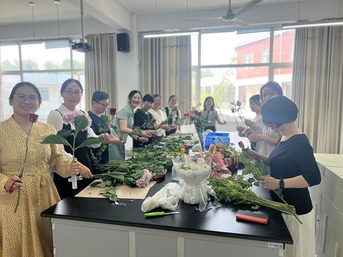 活动伊始,女教师们详细讲解了插花的艺术技巧与花材搭配原则,纷纷动手实践,挑选花材、修剪枝叶、构思造型,展现出了极高的创造力和审美能力。一束束精美的插花作品在她们的手中逐渐成形,现场花香四溢,令人陶醉。