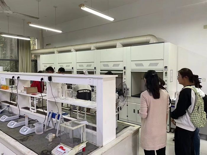 沿着实验中心的走廊,新生们有序地参观了整理、染色、印花公共实验室,公司展示厅,深感实验的神奇和技术的精湛。每一个角落都是科技与艺术的完美结合。在专任教师科研工作室,他们看到了导师们的辛勤付出,体会到了学术研究的严谨与深入。