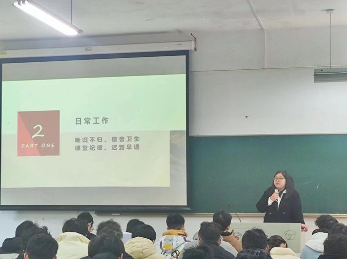 任晓慧作了大三学习生活该如何展开的讲解,重点分析了南京某小区大火事件的起因和造成的严重后果,就如何在校园内安全骑行、规范充电等注意事项进行了强调。解读了近期发生的各类诈骗事件,如网购退款、售卖游戏账号,虚假抽奖活动等,提醒同学们要提高防骗意识,切莫向他人随意泄露账号和验证码等,如遇需要转账的情况一定“三思而后行”。