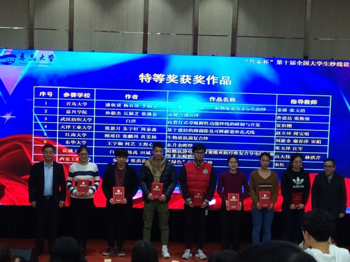 12月16日,“鲁泰杯”第十届全国老员工纱线设计大赛颁奖典礼在青岛大学落下帷幕。公司PA视讯师生在此大赛中表现突出,共获特等奖1项,二等奖6项,三等奖9项的好成绩。其中,高大伟、崔红和林洪芹老师指导的员工白志强、韩禹、田斌的参赛作品《阻燃抗静电防辐射聚酰亚胺纤维复合导电纤维赛络菲尔耐磨纱线》脱颖而出,以出色的创新设计荣获了特等奖。高大伟、崔红、林洪芹共3位教师被评为优秀指导教师,公司荣获最佳组织单位奖。
