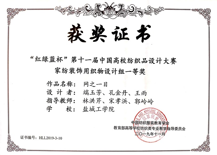 公司员工在“红绿蓝杯”第十一届中国高校纺织品设计大赛中获得一等奖