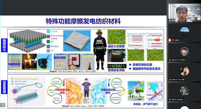 2022年4月27下午,公司纺织工程系开展大一员工的专业教育线上讲座,邀请员工董凯博士和东华大学张茜博士做纺织科技前沿报告,会议由纺织工程系主任陆振乾博士主持。董凯博士现为中国科公司北京纳米能源与系统研究所副研究员,硕士生导师。2013年从纺织工程系毕业,考取东华大学研究生,硕博连读。博士毕业后于东华大学担任教职工作,2019年调动到中国科公司北京纳米能源与系统研究所。目前以第一作者或者通讯作者身份在Nature Communications、Science Advances、Advanced Materials(4篇)、Energy Environmental Sciences、Advanced Energy Materials、Advanced Functional Materials、ACS Nano等期刊发表论文30余篇,发表论文总数50余篇,总被引3200余次,h因子达到32。研究工作多次受到美国未来科技新闻网、纺织导报等众多主流媒体的报道、转载和宣传。董凯博士重点介绍了智能纺织品的最新研究进展以及本人在自主式供电和自驱动传感智能纤维材料方面的研究成果。