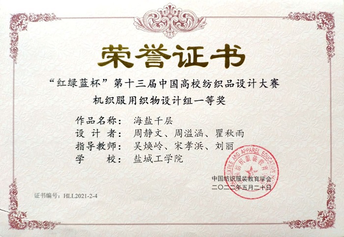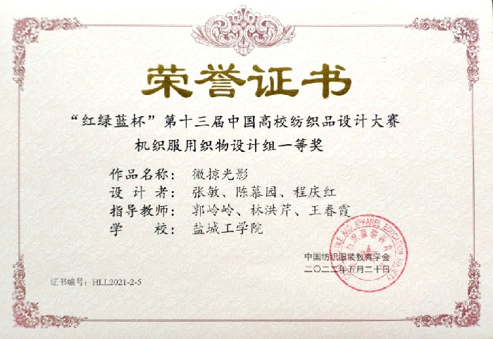 近日,中国纺织服装教育学会公布“红绿蓝杯”第十三届中国高校纺织品设计大赛获奖结果,公司员工团队获一等奖2项,二等奖8项,三等奖22项。其中,由郭岭岭、林洪芹、王春霞老师指导的《微掠光影》作品和吴焕岭、宋孝浜、刘丽老师指导的《海盐千层》作品均获机织服用织物设计组一等奖。